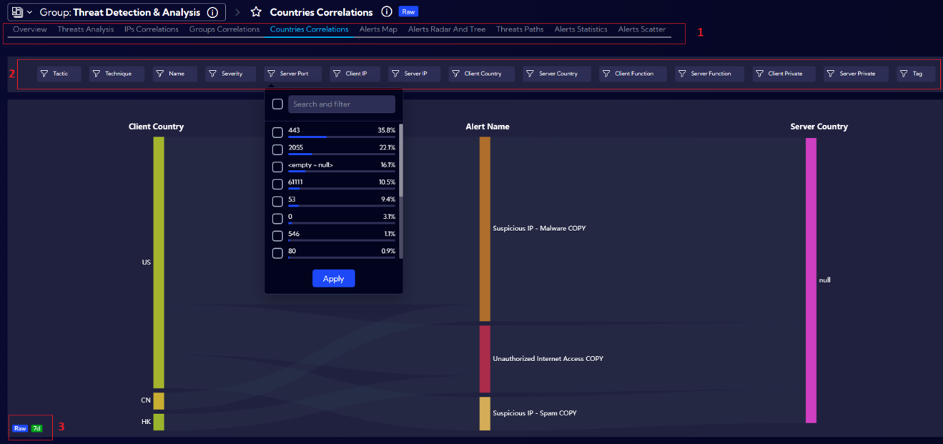 Another example are dashboards that highlight correlations among IP addresses, groups, or countries, where we can focus on unusual traffic characteristics in the context of these parameters.