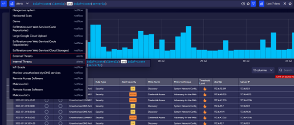 This type of analysis begins by focusing on the standout indicators (spikes, high values, high deviations, unusual combinations, etc.) based on the Threats Analysis dashboard, we are able to analyse correlations among IP addresses related to detected anomalies or threats. This allows us to focus on hosts that are the source or target of many anomalies, so the analytical triggers in this case revolve around deviations of the data in the charts.