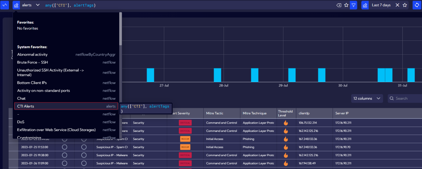 Data context analysis is possible thanks to the data filtering functions, including favourite filters and tags. Favourites filters allows you to quickly analyse threats by context, but also helps in the threat hunting process. For example, among many threats, external or internal threats may be prioritized.