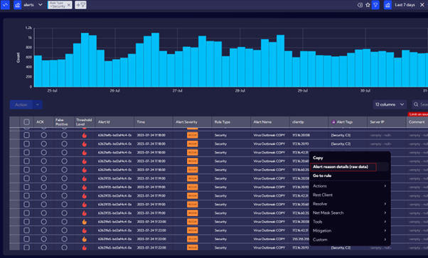 The analysis of events in the alert table, in addition to handling alerts through the ACK or False Positive flags, allows you to view all original data (raw) that triggered a particular alert.