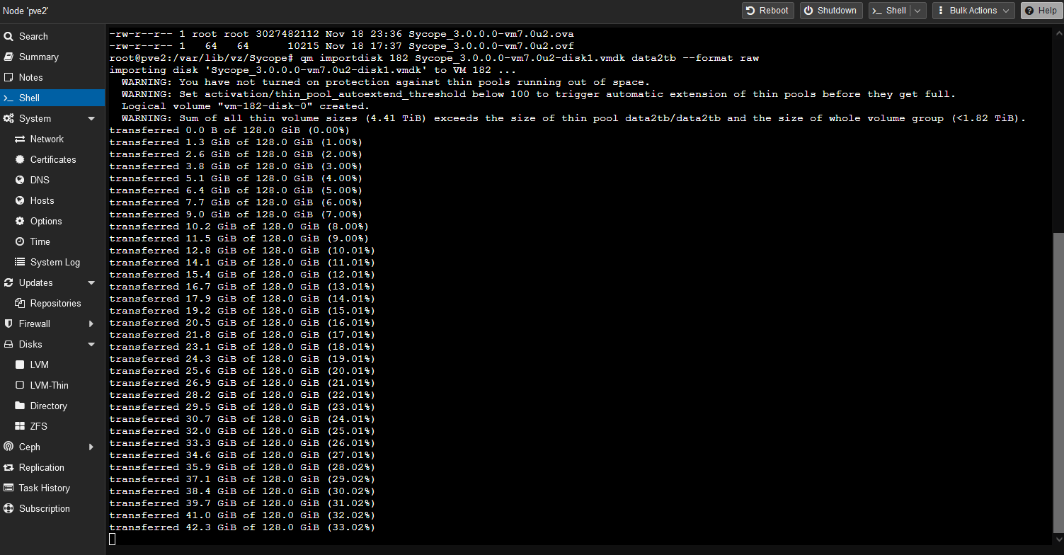 root@pve2:/var/lib/vz/Sycope# qm importdisk 182 Sycope_3.0.0.0-vm7.0u2-disk1.vmdk data2tb –format raw