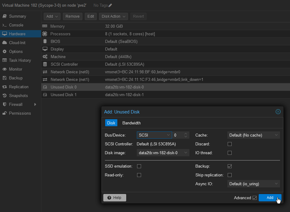 182 is the Virtual Machine ID, which should be adjusted to the ID in your environment. VMDK files for disk1 and disk2 might have different names, depending on the downloaded Sycope version. Also, “data2tb” is the name of the Proxmox storage with our machine.