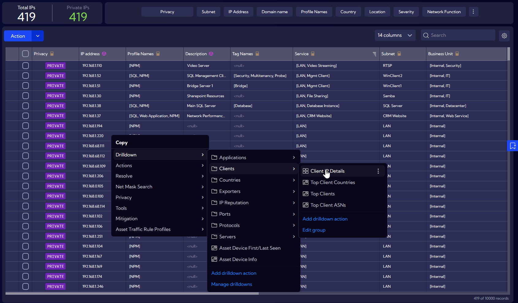 In various places in the product, we also have the option to right-click and access the context menu, including actions and Drilldown views, such as Top Clients, IP Reputation, Top Servers, and many others.