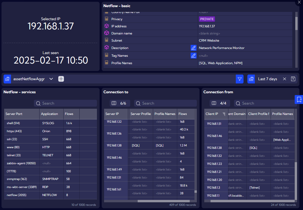 In Sycope, we can freely personalize all views for resources and statistics. In our proprietary Asset Discovery view, we have a list of all IP addresses that were automatically detected. The list can be freely filtered by private or public addressing, profiles, services, subnetworks, tags, description, location, and many others. The user only needs to add custom variables and subnetworks, but the view with resources will be available even without this information.