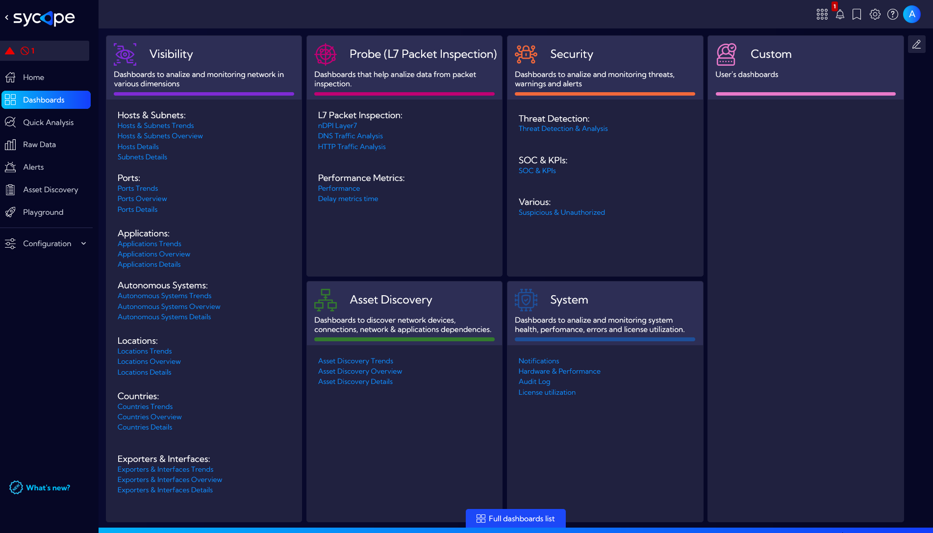 Sycope provides entire groups of views for the user, which are divided both by functionality (Visibility, Probe, Asset Discovery, Security, Custom) and by the method of data presentation (Trends, Overview, Details).