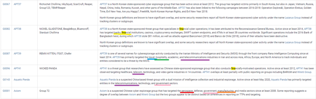 An important concept in threat modelling design is a trust boundary. The trust boundary is a point where the data changes its trust level in the data flow diagram. Typically, this is wherever data is transferred between two processes. In order to identify threats, it is necessary to identify threat actors specific to the sector in which we work. To recognise these groups, you can use the MITRE KB.