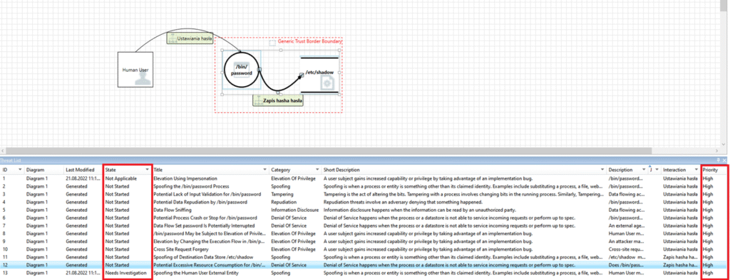 And clicking on the analysis function, threats to the modelled objects are displayed, which should be prioritised and methods of mitigating them described. So the only thing left to do is to review these threats, set their priorities and describe the ways of mitigating them. Of course, if the system does not automatically detect some threats that we know about, we should add them manually.
