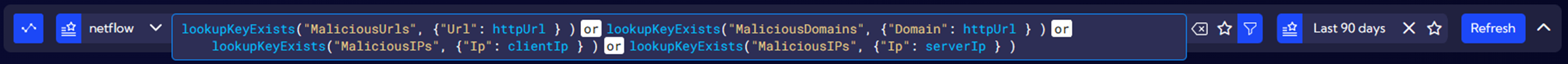 lookupKeyExists(„MalciousUrls”, {„Url”: httpUrl}) or lookupKeyExists(„MaliciousDomains”, {„Domain”: httpHost}) or lookupKeyExists(„MalciousIPs”, {„Ip”: clientIp}) or lookupKeyExists(„MalciousIPs”, {„Ip”: serverIp})
