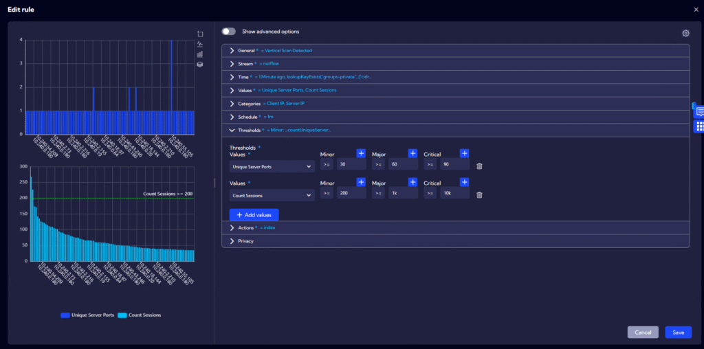 Sycope Security is a set of multiple rules used to detect volumetric and quality anomalies in network traffic. Among the nearly 60 detection methods are methods for detecting horizontal and vertical network scans. The idea behind them is to calculate the number of unique address and port pairs and the number of sessions established.
